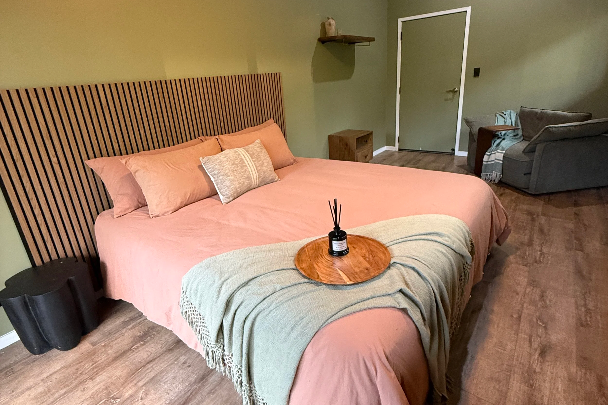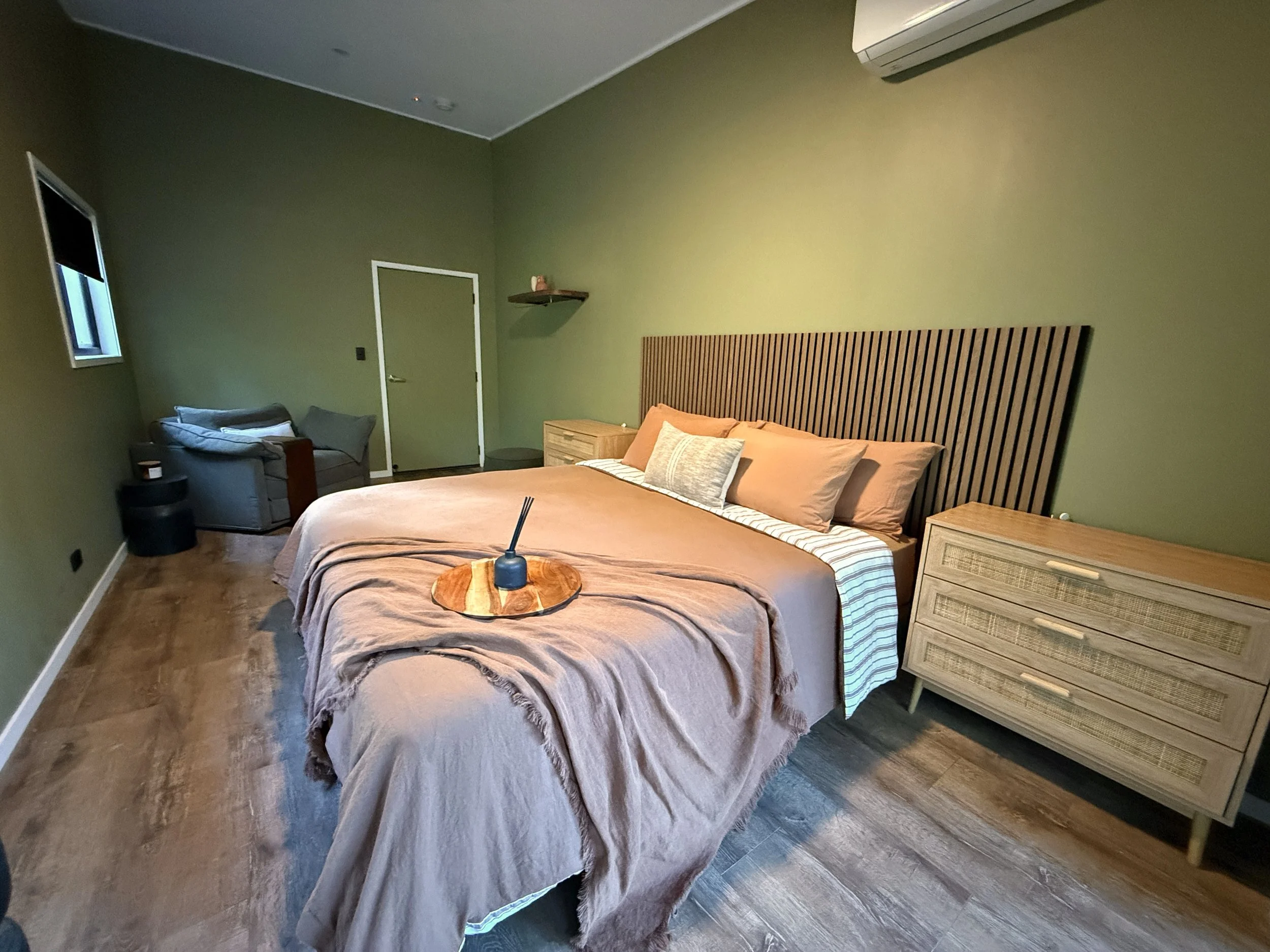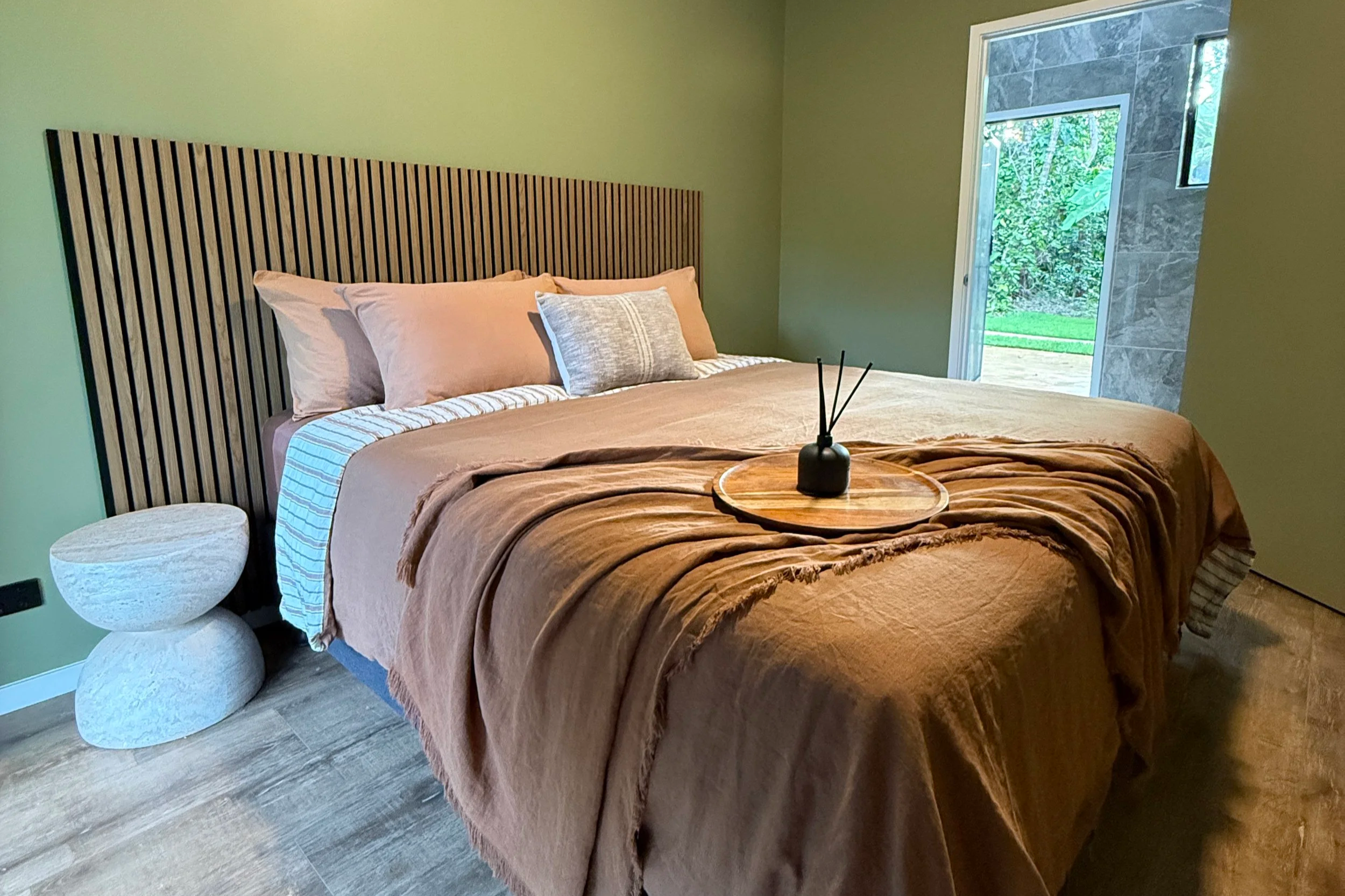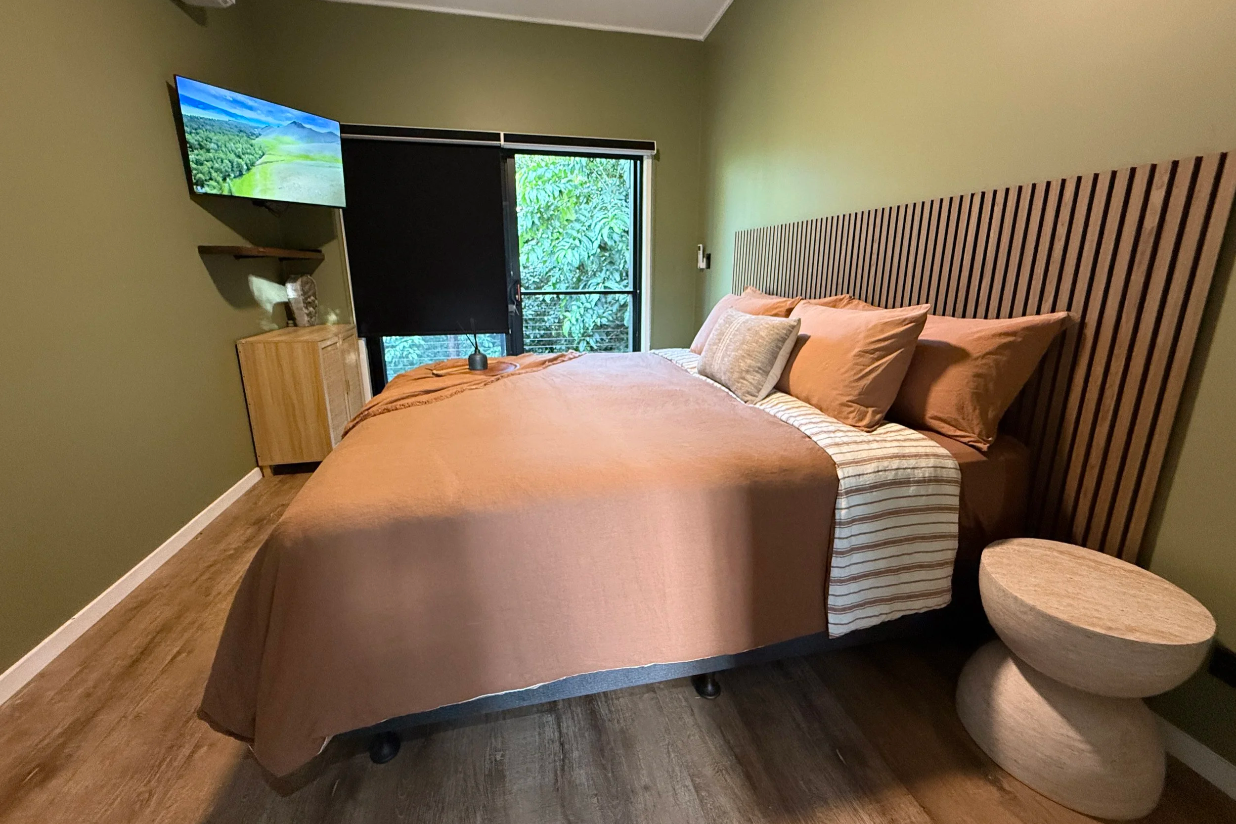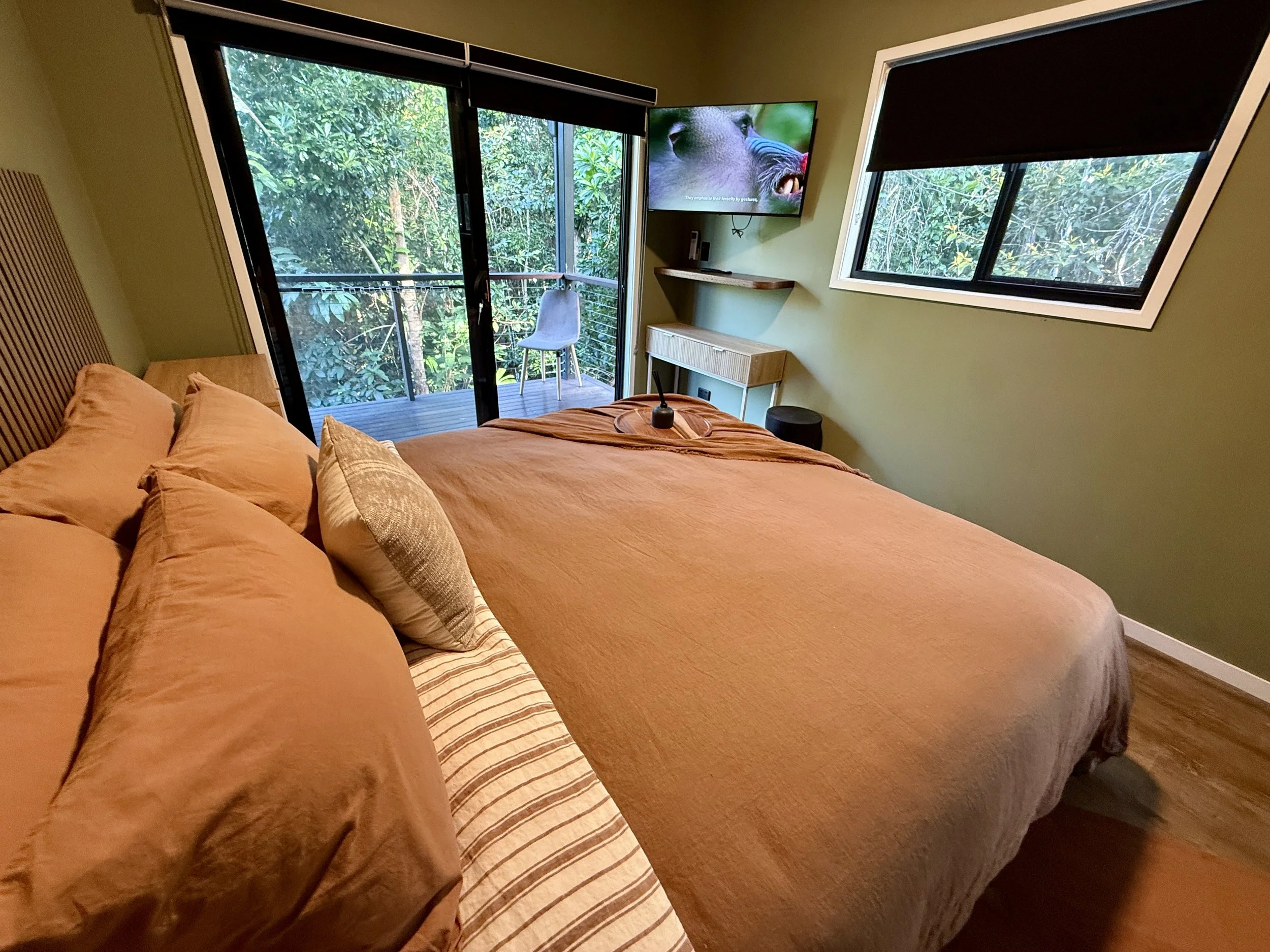 Furnished with a King Bed, air-conditioning, fan, WiFi and a 60" Smart TV it also contains a well appointed ensuite accessible from both inside the room and the adjoining deck.