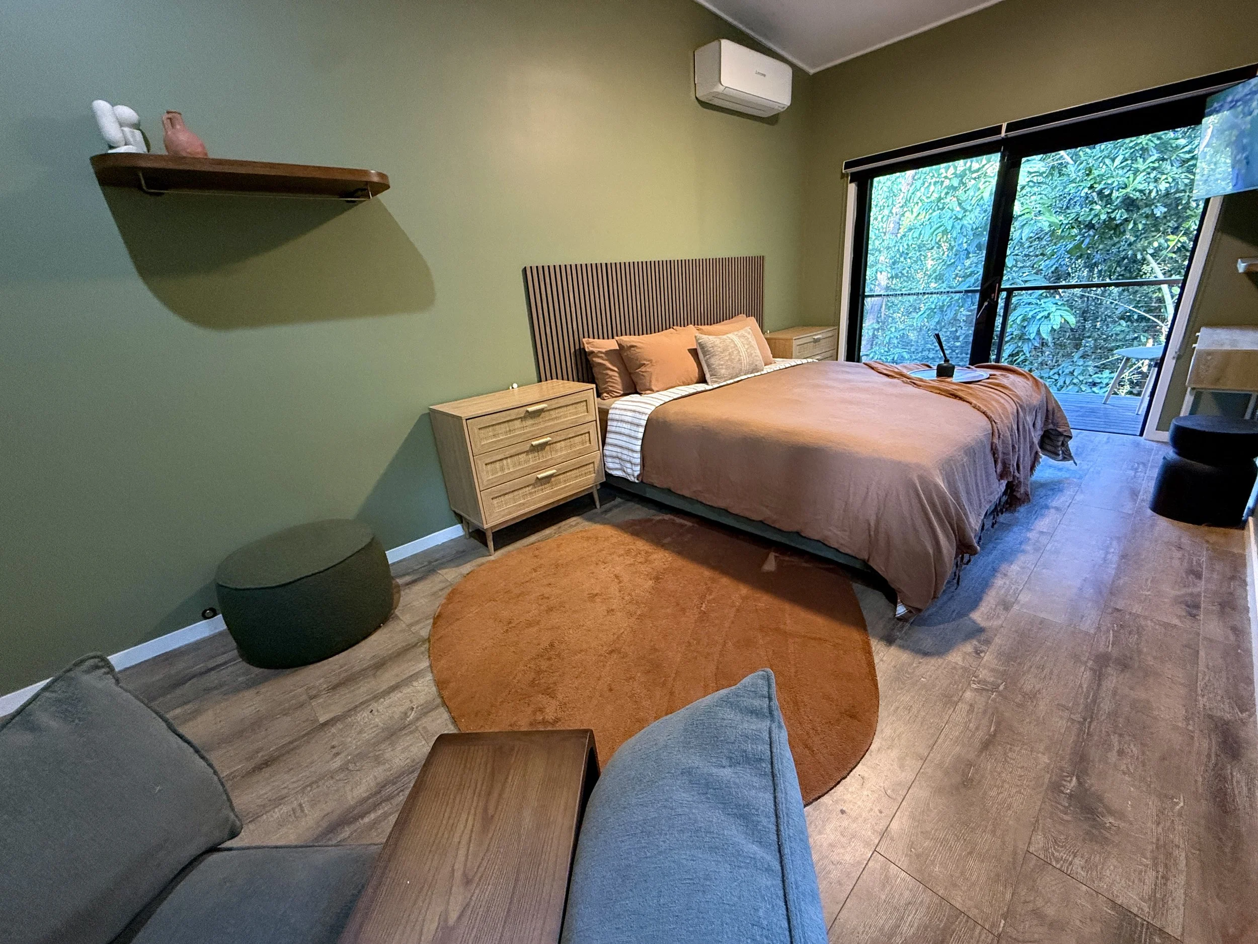 Furnished with air-conditioning, fan, WiFi and a 42" Smart TV it has dual access, opening onto the deck with rainforest views and the middle pathway through the lodge. A separate bathroom is available next to the pool.
